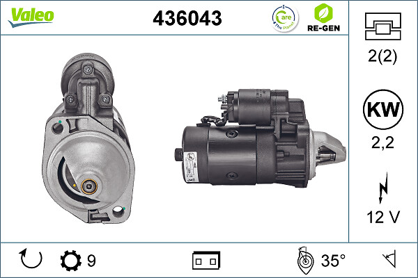 VALEO 436043 VALEO RE-GEN REMANUFACTURED. Clamp: NO. Number of Holes: 2. Number of Teeth: 9. Number of threaded holes: 2. Position/Degree: L 35 °. Rated Power [kW]: 2,2 kW. Rotation Direction: 0. Voltage [V]: 12 V